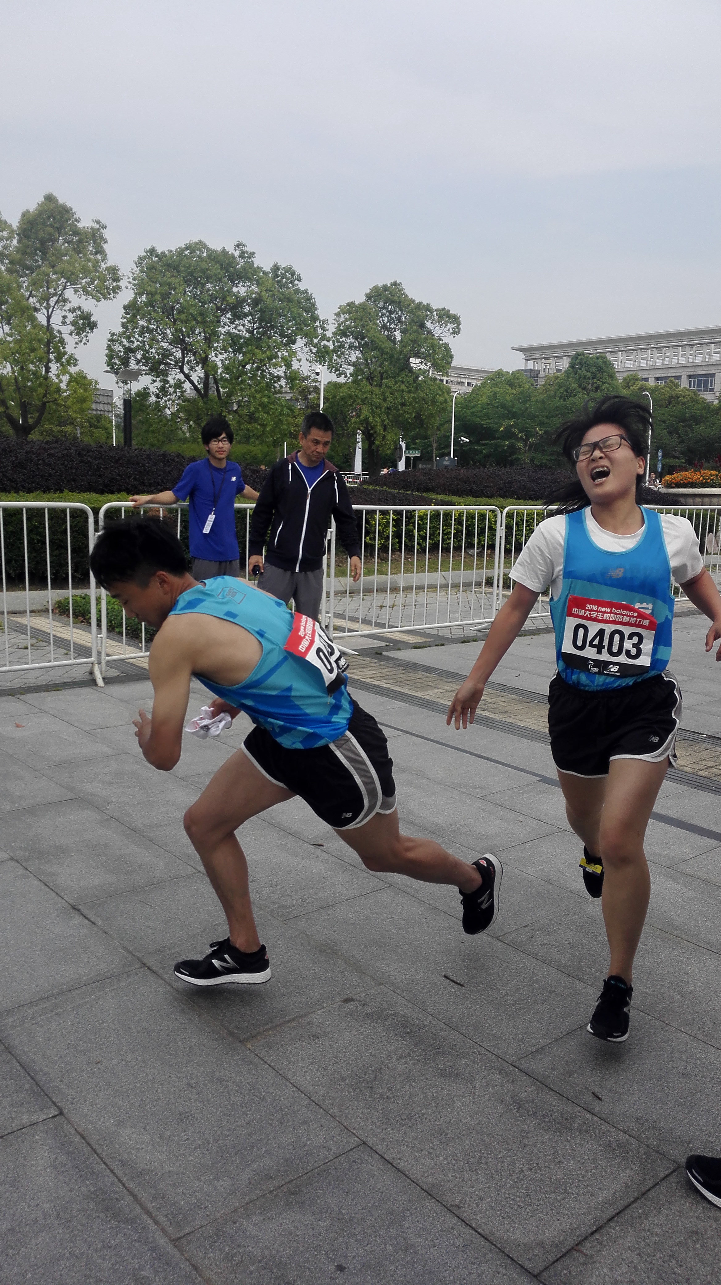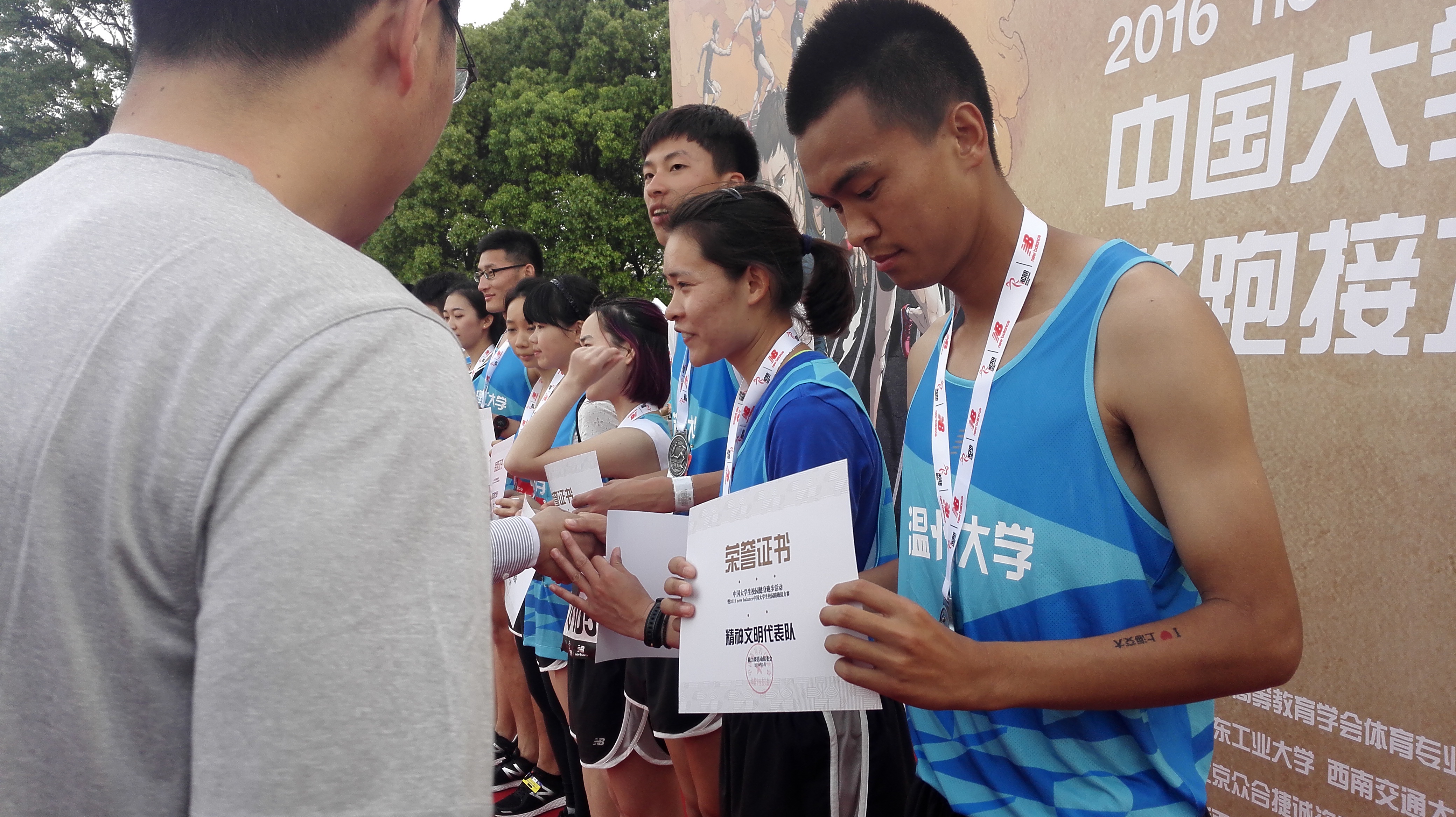 中国大学生校园路跑接力赛,简称NCRR,它是在教育部高教委导下,以“发展高校体育”为宗旨的校园体育工程,此赛事是首个国字号面向高校、面向社会的接力赛,横23市,共分为6大,参加队2200支。比为公开组和菁英组,华东赛区由上海交通大学、上海大学、扬州大学、苏州大学、BB贝博艾弗森官方网站、浙江工业大学、浙江大学、宁波大学、华东师范大学等12支队伍参赛。由体育学院伟青院长为、李炎老为教练、体育学院的戴立浩、蒋晨晨、廖新新、瓯江院的刘、教师教育学院璐依等10名同学组成的州大学跑接力队加了菁英组比,经过了激烈的角逐,我校接力队取得了第三名的优异佳绩授予精神文明代表队。冠亚军分别被扬州大学、苏州大学获得。