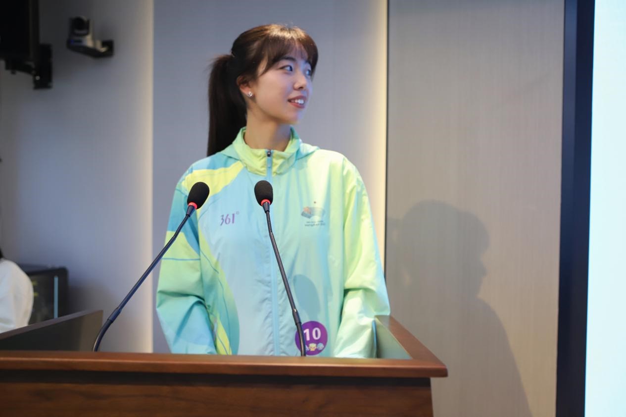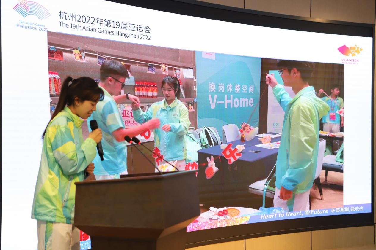冯珈瑜同学以“志愿精神闪耀赛场内外”为主题,讲述了在万豪酒店23天服务的故事。对她而言,以小青荷的身份为亚运贡献光热,温暖微笑、细致服务、默默坚守,让青春绽放出绚丽之花。