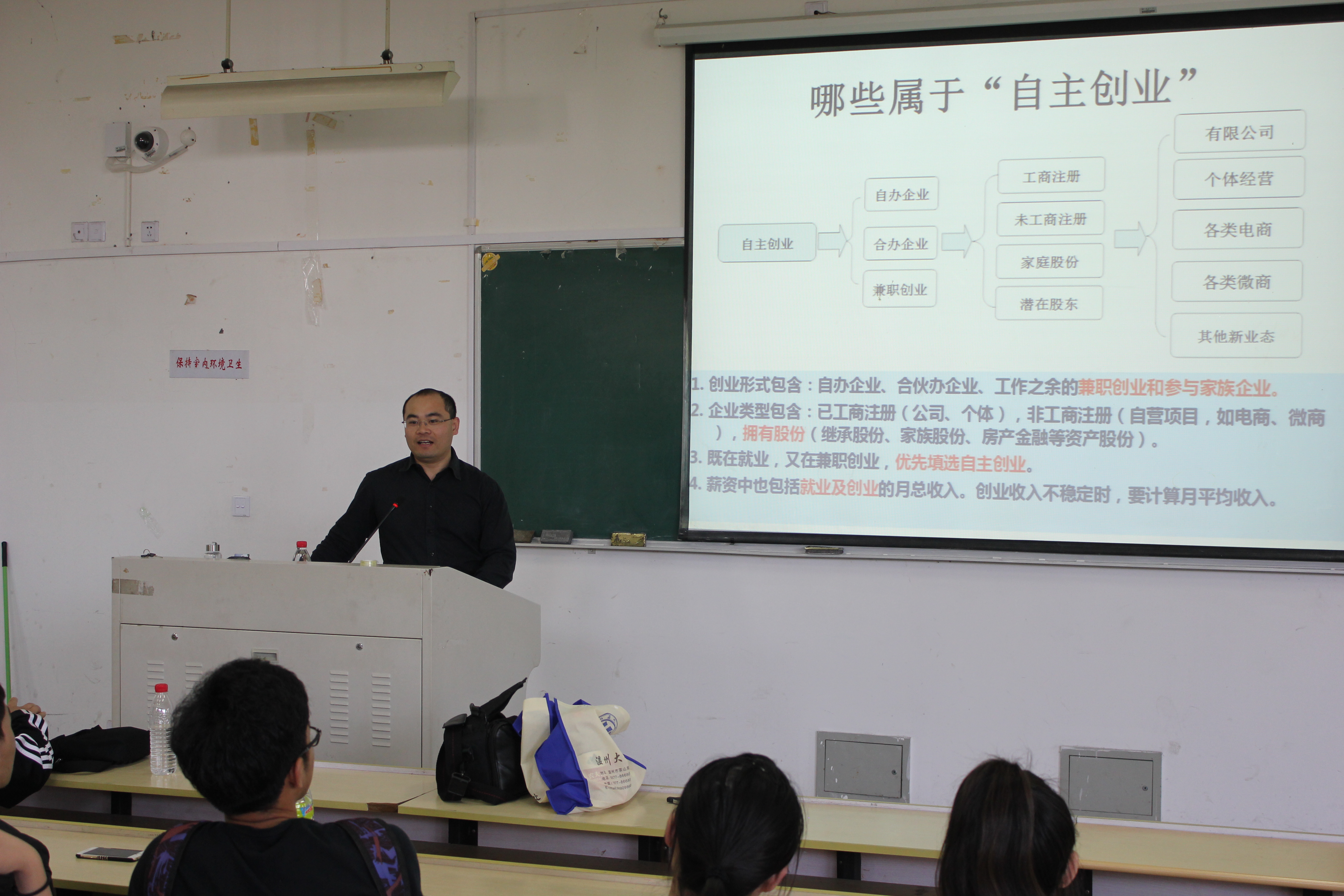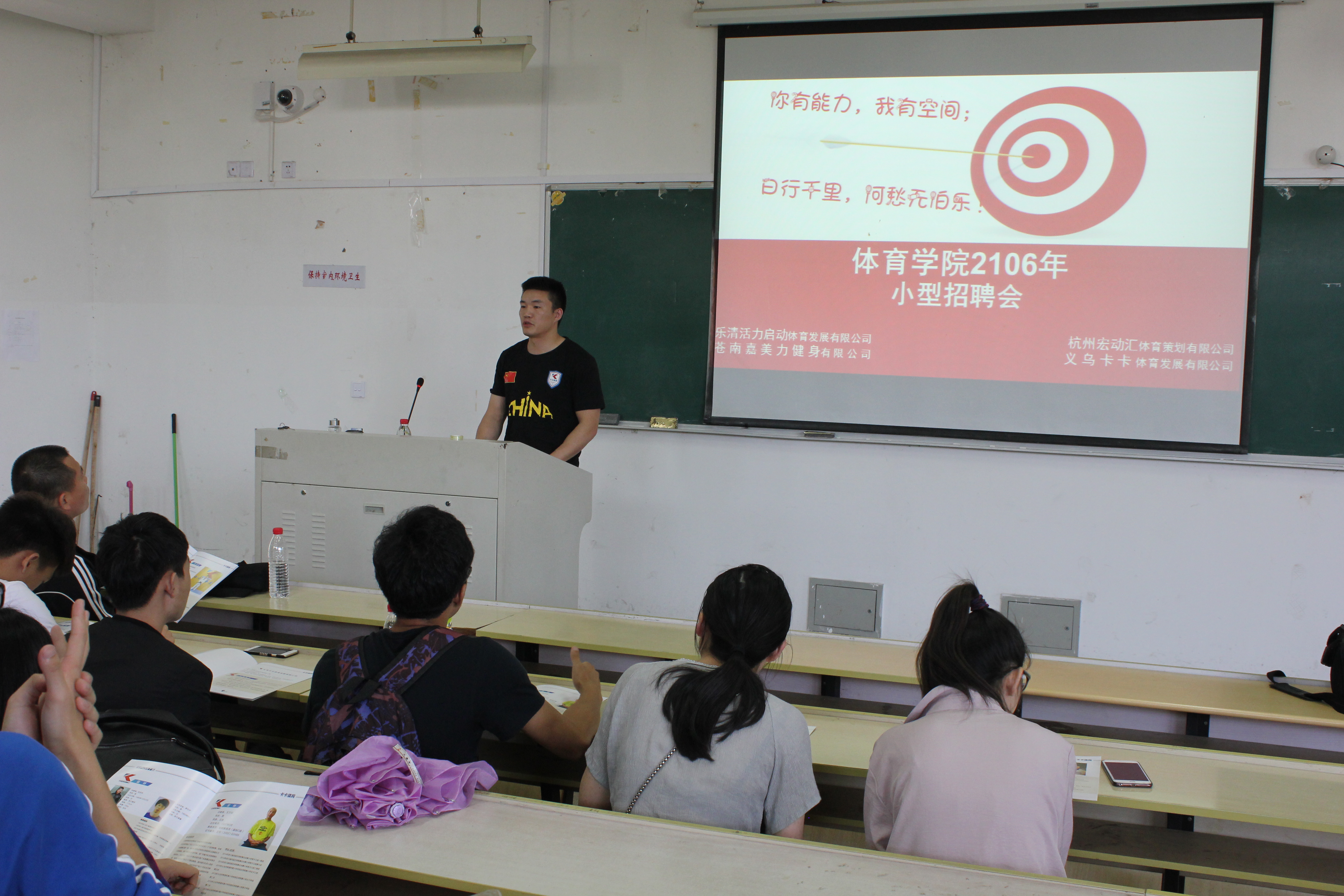 会议中,体育学院周冀书记就就业形势,就业政策和就业流程等方面,结合体育学院学生的实际情况,生动讲解了体育学院学生结合自身专业特质如何制作简历以及就业过程中需要把握的几个主要的时间段,使在座的学子受益匪浅。接着辅导员郑兆钧老师就学生比较关注的“五险一金”、自主创业等与学生自身利益密切相关问题进行生动细致的讲解。班会后,义乌卡卡体育发展有限公司和苍南嘉美力健身有限公司的负责人进行了一个小型的招聘会,学生就自身比较关注的岗位问题,薪资待遇问题进行了相关的提问。