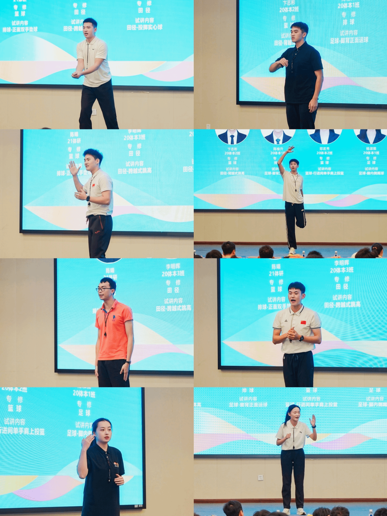 本次就业实战模拟试课问诊会共有8位2024届本研毕业生代表抽取体育学科招考热点项目(三大球、体操、田径)进行现场模拟试课。通过分组抽签抽题,现场模拟上课。8位学生代表展示了精彩的实战授课,不仅为现场观摩的毕业班及低年级生带来不同程度的有益启发,也将鞭策自己教学实践能力的进一步发展。