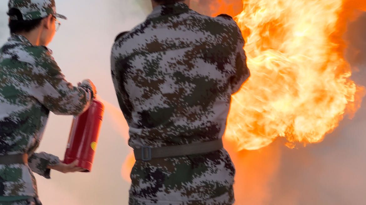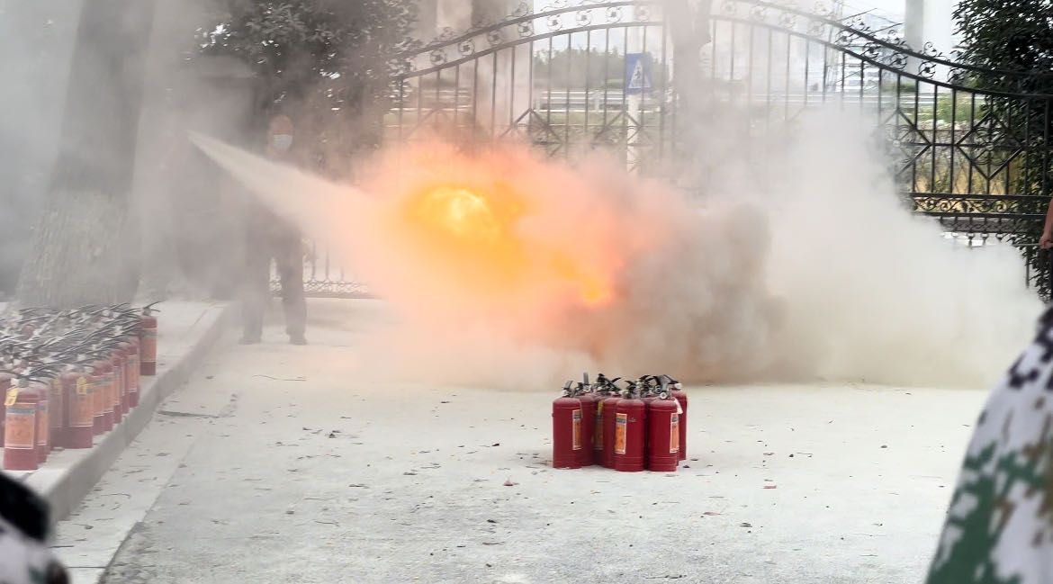 同学们在义务消防队员的指导下,踊跃参与油桶灭火演练。大家拿起灭火器进行实战练习,按照灭火器“提、拔、握、压”使用步骤,走到指定位置对准油桶火焰喷射,一瞬间,烟雾将大火笼罩,熊熊火焰被成功扑灭。