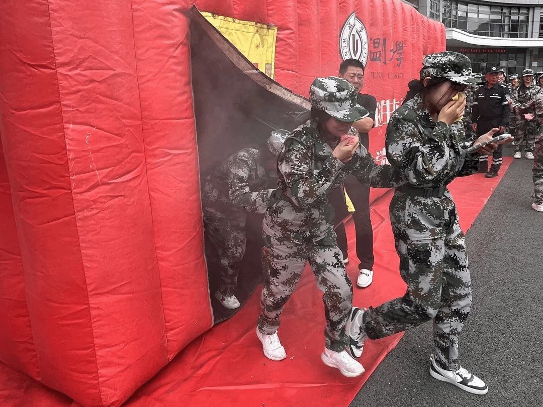 新生们在义务消防队员的指导下,排成列队用湿毛巾捂住口鼻,弯腰俯身逐个走进模拟火灾逃生体验屋,亲身体验模拟火灾情景,亲自实践逃生技巧。