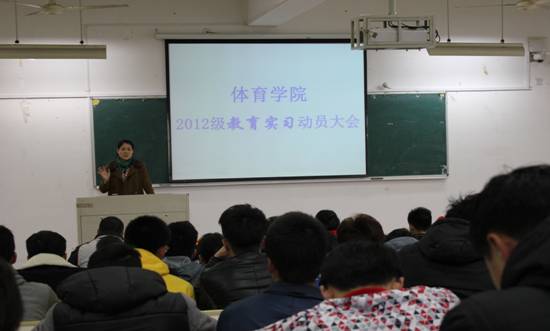 张秀华副院长动员讲话:张秀华副院长首先详细阐述了教育实习的具体安排、作用、具体要求,强调了实习的重要性,对实习过程中的注意事项进行了具体说明。重点指出在实习过程中要发挥体育专业的特长,协助实习学校开展各项活动,要求全体学生在实习过程中努力掌握教学过程的特点、规律,在教育实践中不断提高自身的教学素养和教学能力。希望全体实习生要以正确、积极的态度看待实习,树立信心,完成从学生到教师的角色转变,以踏实的工作作风和严肃认真的态度完成此次教育实习任务。会上张秀华副院长对实习生的生活、安全方面也提出了具体的要求,如实习生在实习期间要注意自己的言行举止、穿着礼仪以及上课的时间观念等。最后,张秀华副院长希望全体实习生做好实习前准备,并预祝BB贝博艾弗森官网实习生实习期间取得优异成绩,祝本届实习工作取得圆满成功。