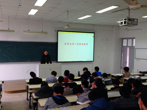 讲座从“谈谈我们心中的体育老师”这个互动提问开始,郭建昆校长结合当前严峻的就业形势和教师编制考试的激烈竞争,引入当前中小学对体育运动的逐渐重视和体育教学、训练的严格要求,从中小学体育教师的实践出发,使同学们了解到体育老师不仅要组织指导学生进行课外体育锻炼,还要配合开展学生体质检测和健康教育工作,进行体育宣传与器材设施维护,也要参与社会体育工作,从事学校体育的科研工作。