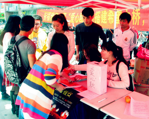 连日来,BB贝博艾弗森官方网站体育学院研究生会和超豪学区通过传单、海报、条幅、微博、QQ群等对本次活动进行了广泛的前期动员宣传。28日上午9点,同学们在超豪学区餐厅门口早早布置好活动场地,将“爱心瓯柑”整齐地摆放在爱心义卖摊位上,正式开始义卖募捐活动。活动现场,许多过往师生主动走到义卖摊位前仔细询问情况。在了解活动内容之后纷纷解囊,购买“爱心瓯柑”,积极为灾区奉献爱心。特别是过往的BB贝博艾弗森官方网站研究生见此情景后都进行了慷慨捐助。与此同时,同学们还在爱心条幅上送出了自己对雅安的祝福和支持。交易是爱的传递,捐赠是真诚的祝福。涓涓细流汇海洋,点滴真情聚雅安。