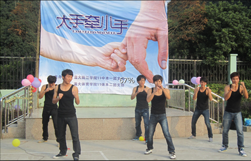 2011年12月14日下午12点整,BB贝博艾弗森官网11体本2班全体同学与瓯江学院11中本一团支部汇集在一起,骑着自行车向茶山镇第二小学进发,20分钟的车程后,浩浩荡荡地到达了目的地。此次前往旨在举行“服务社会——‘大手牵小手"团日活动。针对小学生的兴趣爱好及学院特色在茶山二小举行演出。