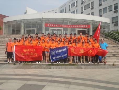 首先指导老师代表李春华老师和院党委书记杨志敏发表讲话。接下来各实践队对长简述了自己的实践队和工作计划。冯建军老师还给2011年暑期社会实践方案策划大赛得奖队“盛夏年华阳光雨露”暑期社会实践队颁发了奖状。大会临近结束时进行了授旗仪式同时各队均接受了1000元的启动资金。最后实践队员们与老师们一起在行政楼大门前进行了合影留念。