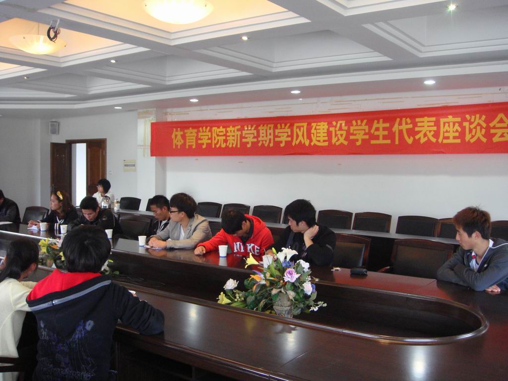 党总支书记杨志敏老师首先作了发言,他强调了本次座谈会的重要性,指出这次座谈会是以在老师与同学之间开展一次深入交流、交换思想的“茶话会”的形式进行的,在会上务必使参会的所有人能在和谐的气氛中进行坦诚地交流,促进学生与老师之间的相互沟通和了解,并针对目前体育学院在学生管理中存在的问题共同探讨对策,促进体育学院更好更快发展。鼓励大家就学习、考风、生活等方面的问题畅所欲言,主动发言,积极参与讨论,并表示学院尽最大可能帮助学生解决学习和生活中遇到的实际困难。与会同学就如何进一步加强学风建设展开了热烈地发言,如寝室的文化建设、运动场馆的开放管理、如何上好早自习、上课的出勤情况及考风等问题,找出了问题根源所在并提出了相应的解决办法。