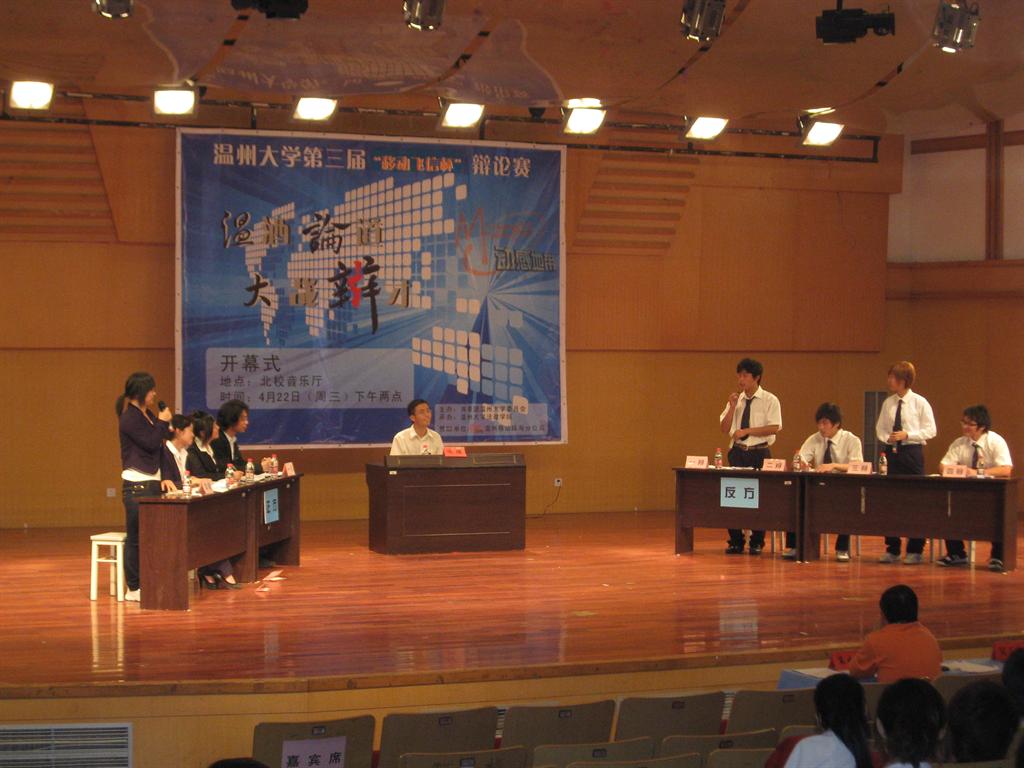 2009年4月22日晚18:30,体育学院参加了在BB贝博艾弗森官方网站北校音乐厅举行的由共青团BB贝博艾弗森官方网站委员会主办,共青团BB贝博艾弗森官方网站法政学院委员会承办,中国移动温州瓯海分公司赞助的BB贝博艾弗森官方网站第三届“移动飞信杯”辩论赛的预赛。体育学院应战演讲、辩论协会关于“大学生能力与社交能力哪个更重要”的论点。