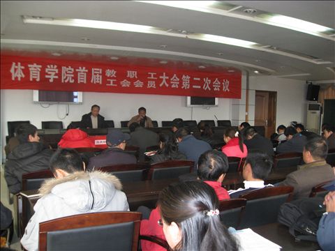 体育学院首届教职工暨工会会员大会第二次会议在学校领导的关心,学校工会、人事处相关职能部门的指导下,2008年12月24日下午在北校区行政楼三楼会议室召开,大会由党总支书记杨志敏主持。