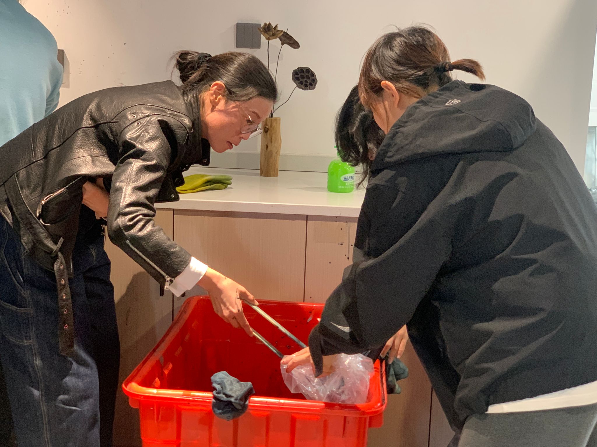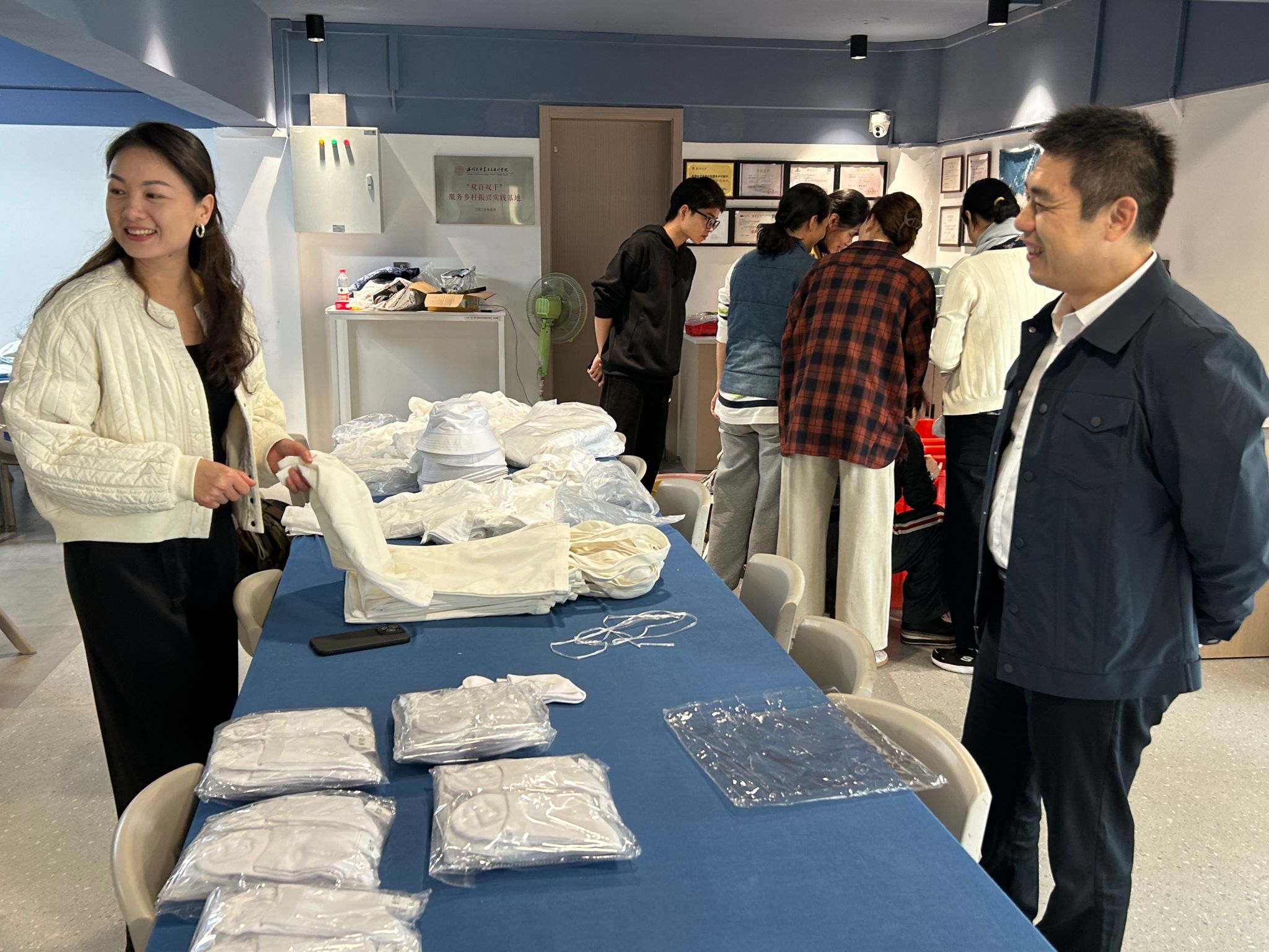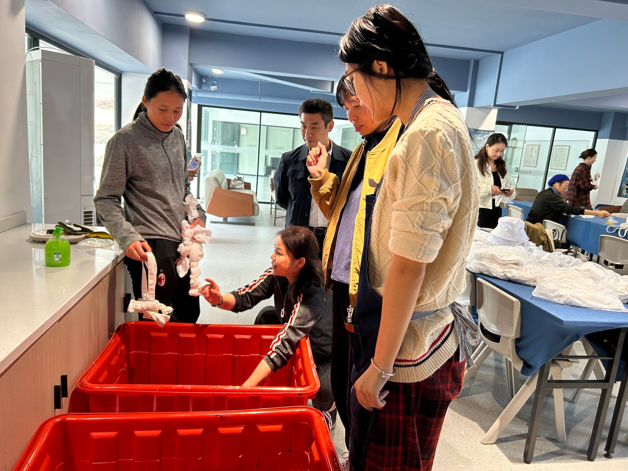 美术与设计学院叶茜副教授作为特邀主讲和活动指导。活动初始,学院为大家精心准备了服饰、橡皮筋以及其他相关工具,老师们仔细挑选自己喜爱的服饰种类为后续扎染做准备。