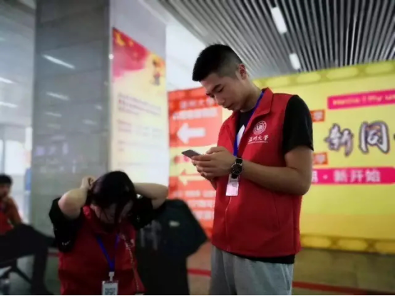 炎炎烈日没有阻碍志愿者们工作的激情,更是激发着他们的热情。他们各司其职,有人接待新生,有人帮助新生照看、搬运沉重行李,有人帮助新生顺利完成缴费报到的工作,有人引导新生到宿舍入住;学长学姐志愿者们在工作的同时也热心给新生们解疑答惑,并介绍学习生活经验,他们热情周到的服务、温馨甜蜜的笑容使新同学感受到了来自学院领导、老师以及学长学姐们的亲切关怀。