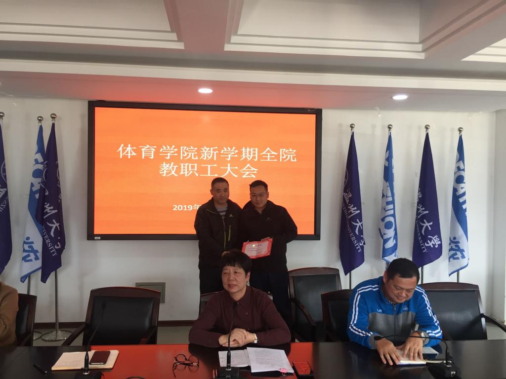 张院长首先简要总结了学院上个学期各项工作,对本学期重点工作进行了部署。并颁了2018年学院贡献奖,体育学院体质健康测试团队获此殊荣,以奖励该团队在2018年体质健康测试和光氧运动中做出的成绩。他希望在新的一学期全院要再接再厉,紧紧围绕学校的重点工作,扎扎实实做好学院的各项工作,为学校升博和申报省市共建省重点高校做出贡献。