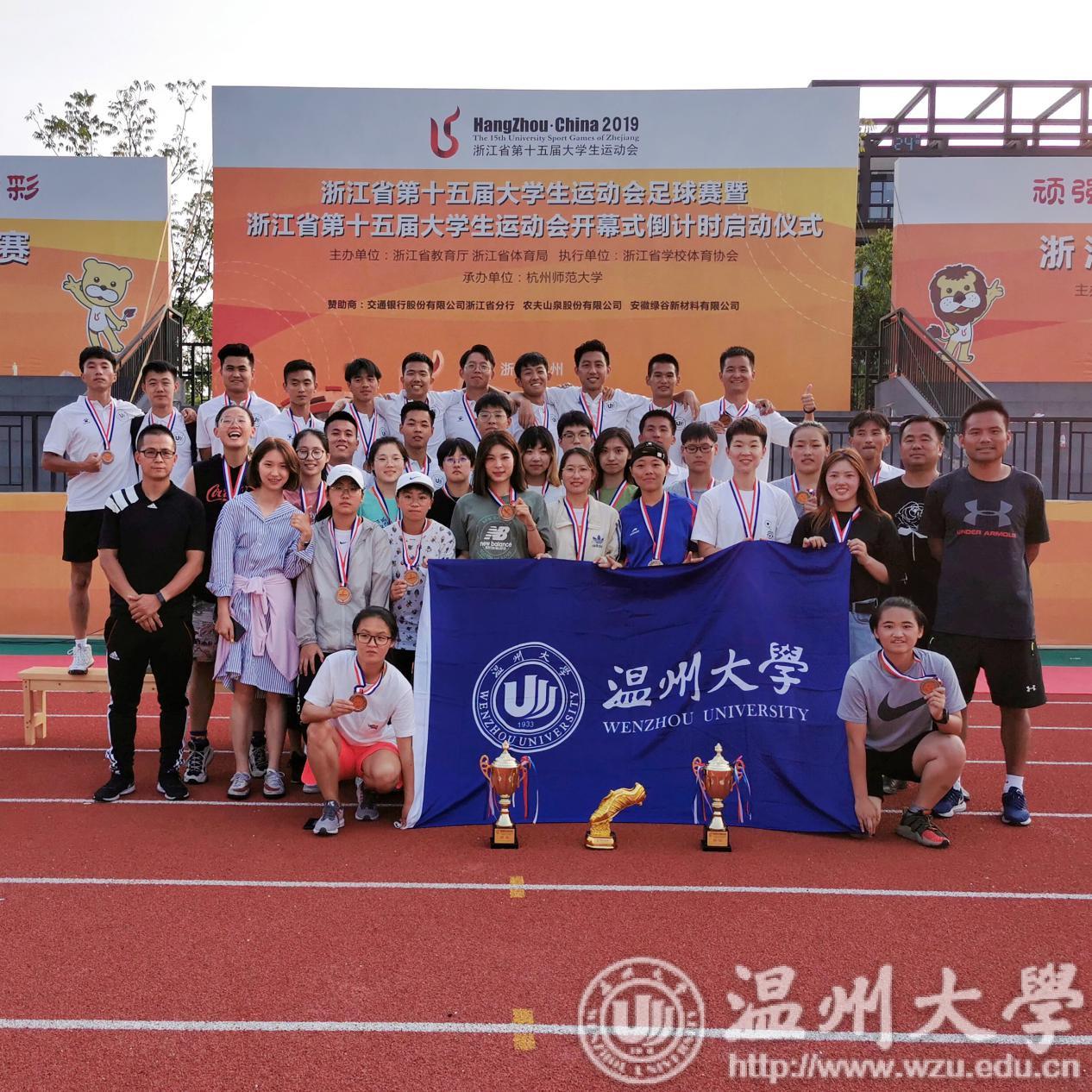 浙江省第十五届大学生运动会足球比赛(丙组),于6月15日在杭州师范大学圆满落幕。本次比赛从6月10日开幕,我校男、女足球队联袂出赛,经过6天连日征战,在林小义、林辉两位教练的指导下,男女足球队双双获得铜牌,男子足球队创造了参加大学生运动会历史最好成绩,女子足球队是首次成绩大学生运动会。我校男运动员蓝勇飞获得男子最佳射手奖,队员徐安平、付轩、瞿繁、朱建伟、潘婕、麻纯洁、赵珺雅和朱郑妍等八位同学获优秀运动员称号。