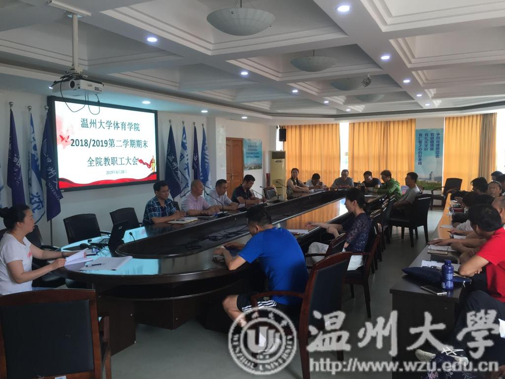 6月28日下午,BB贝博艾弗森官网在北校区行政楼125会议室召开了2018/2019第二学期全院教职工学期总结大会暨期末全院教职工思想政治教育动员会,体育学院党委书记应中、院长张文健、副院张叶建强、副院长赵海波、组织委员张胜帮及全院教职工出席了会议。会议有张文健院长主持。