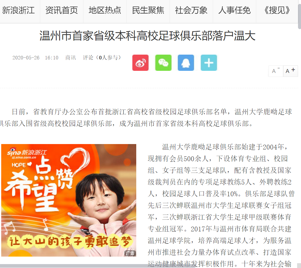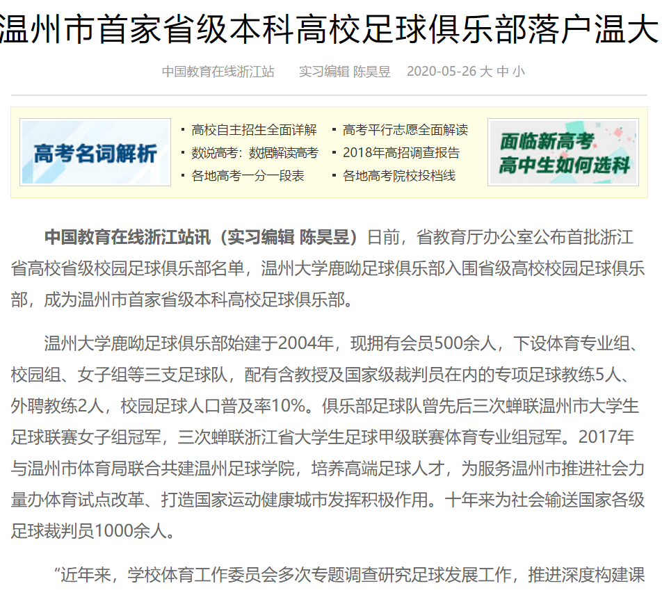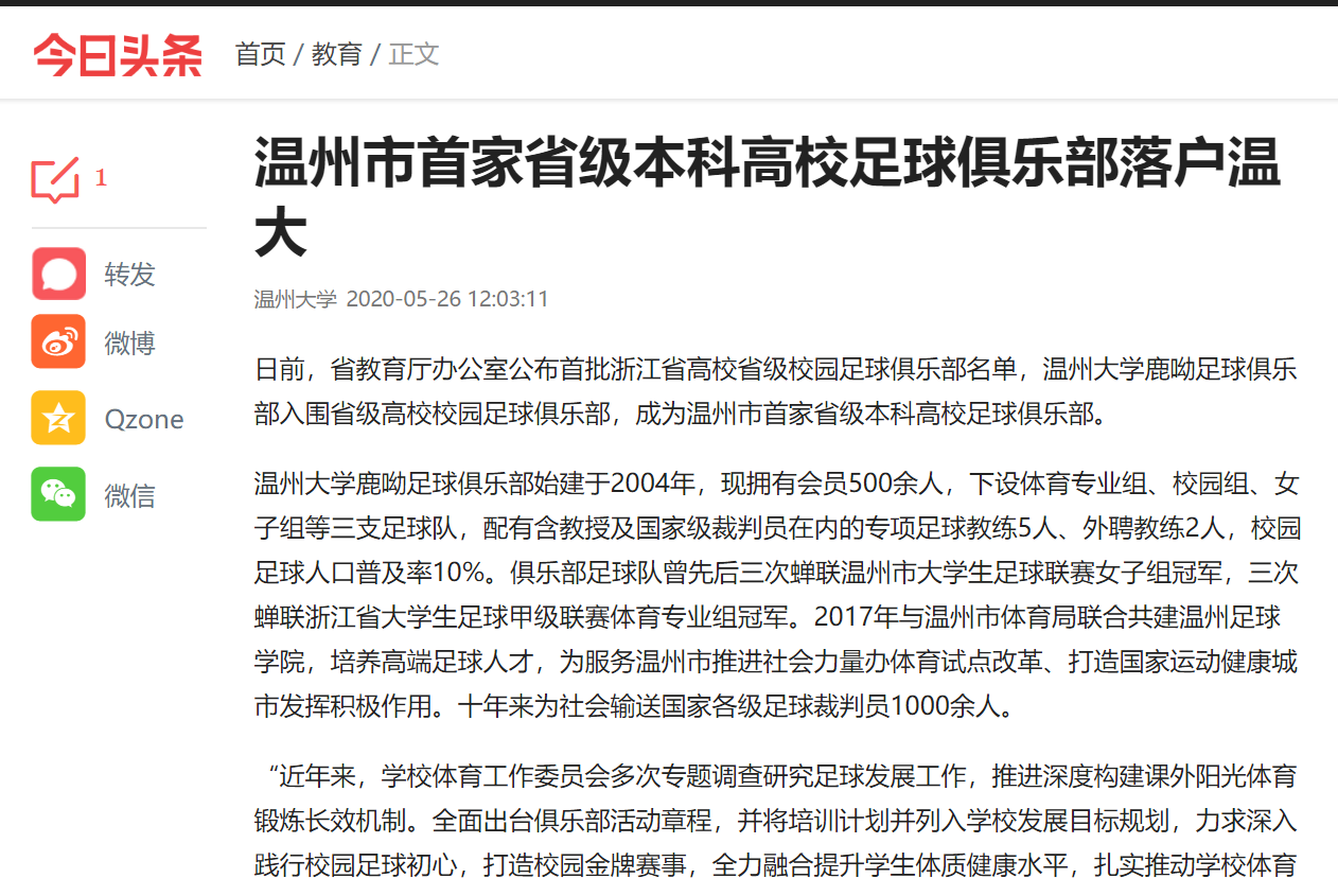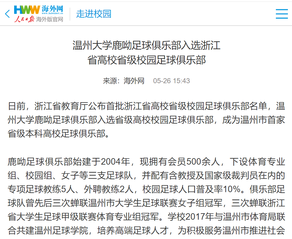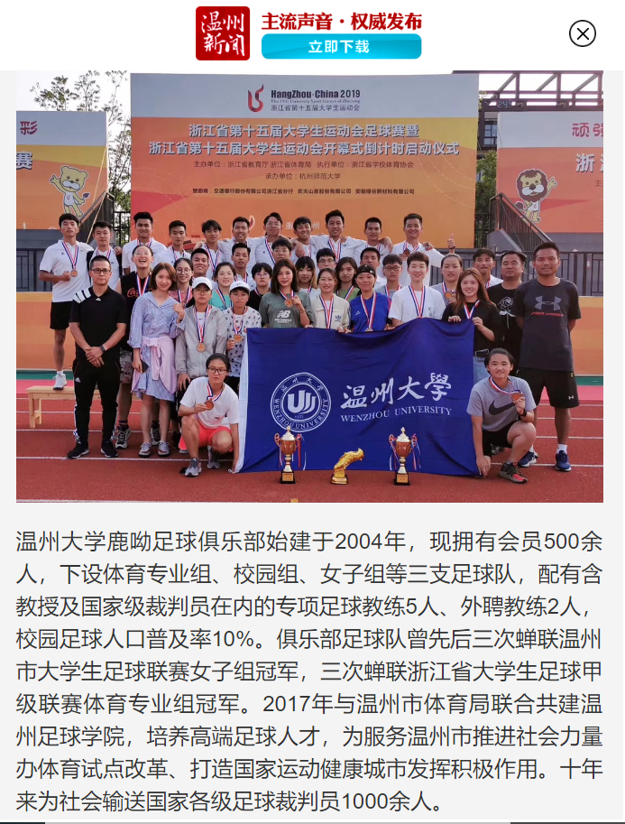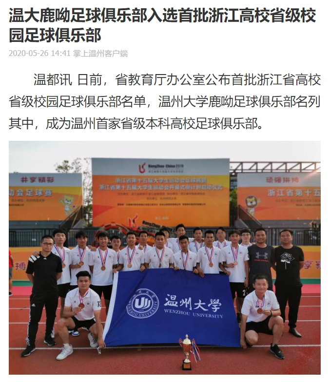 日前,人民日报、中国教育在线、今日头条、新浪浙江、温州新闻、温都全媒体等媒体先后报道 了BB贝博艾弗森官方网站鹿呦足球俱乐部入选浙江省高校省级校园足球俱乐部的喜讯,令全院师生备受鼓舞。今天就一起来回顾鹿呦奋力拼搏、执着前行的成长轨迹吧!