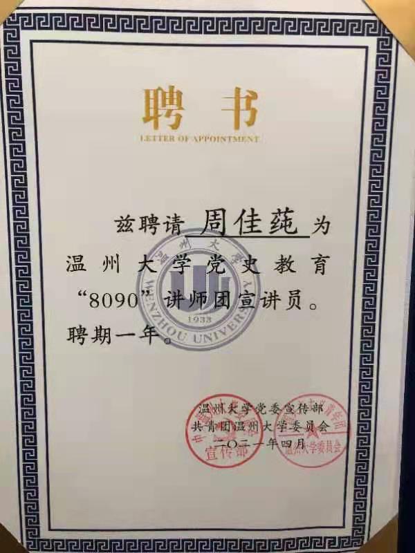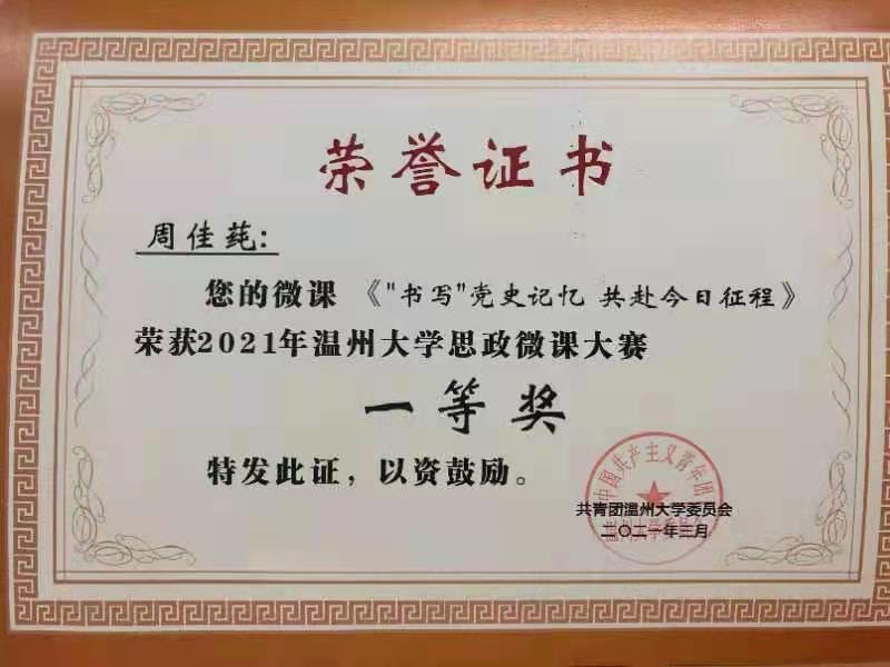 日前,我校20级体研周佳莼同学以微课《“书写”党史记忆 共赴今日征程》荣获2021年BB贝博艾弗森官方网站思政微课大赛一等奖,并将推送参加省赛。同时被受邀成为BB贝博艾弗森官方网站党史教育“8090”讲师团宣讲团宣讲员。这是该生获得2020年温州市廉政演讲大赛一等奖以来的再次获一等奖。