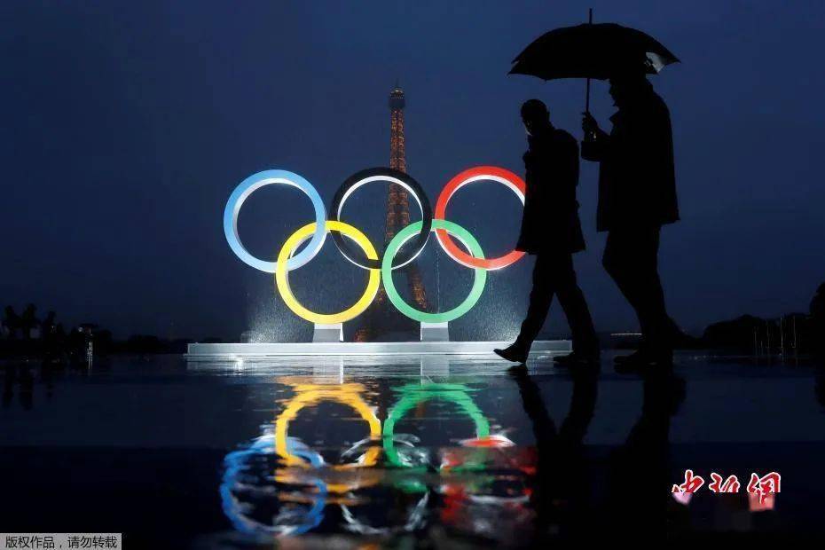 资料图:当地时间2017年9月13日,法国巴黎,奥运五环标志在埃菲尔铁塔前竖立。