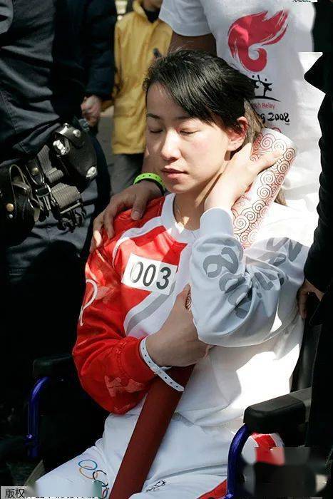 资料图:当地时间2008年4月7日,北京奥运圣火在境外传递时遭遇干扰,中国残奥会击剑运动员金晶坐在轮椅上紧紧保护着熄灭的奥运火炬。