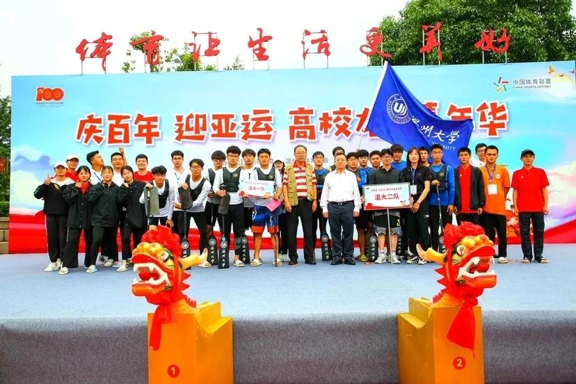 首先进行的是100米直道赛。发令号响,鼓声骤然密集起来,划手们节奏统一,船速不断加快,大家使出浑身力气,奋勇争先,龙舟在舵手的掌控下向终点迸发。经过激烈角逐,最终,在学生组中,温大一队、温大二队、温科职院一队获得一等奖;在教工组中,温州医科大学、温大数理学院获得一等奖,其余队伍分别获得二、三等奖。