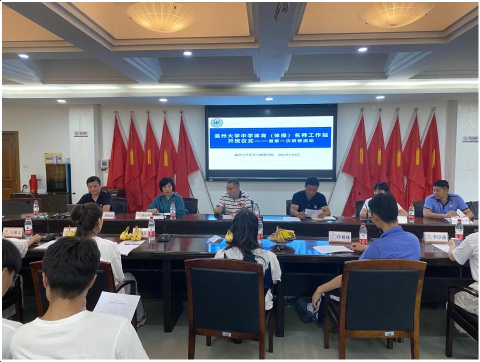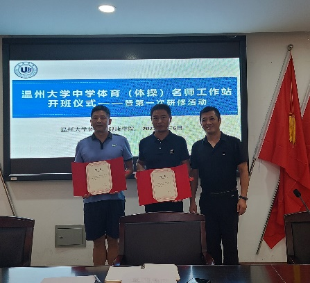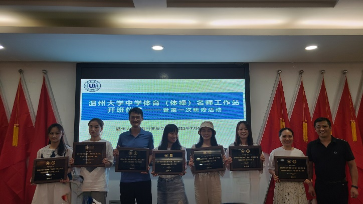 2021年7月6日下午,工作站在BB贝博艾弗森官方网站125会议室举行开班仪式暨第一次研修活动。BB贝博艾弗森官方网站院长张文健教授在致辞中,对各位学员表示热烈欢迎,并就学院学科和专业发展等情况进行了详细介绍,同时希望以名师工作站为桥梁,进一步加强体育教育专业与温州市基础体育教育工作的关联度。随后进行了导师聘任和实践基地授牌仪式:温大体健学院李春华和温州市绣山中学体育组组长张洪江两位老师,代表导师团队接受导师聘书;现场还为温州市第二外国语学校、温州人文高级中学、温州市南浦实验中学、温州市绣山中学、温州市第十二中学、温州市第二实验中学、温州市南浦小学、温州外国语小学、温州市双屿小学营楼校区等11所学校进行了实践基地的授牌仪式。