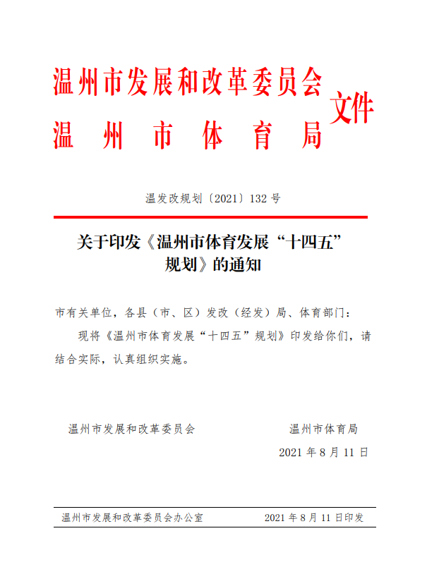 我校张文健教授主持起草的《温州市体育发展“十四五”规划》于2021年8月11日发布实施。BB贝博艾弗森官方网站为项目委托起草单位、张文健教授为项目主持起草人。