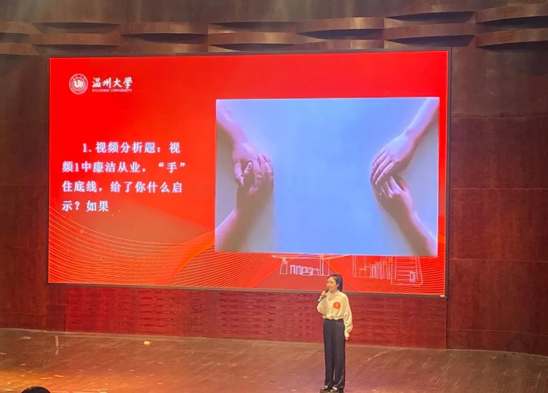 比赛共分为两个环节。第一轮为主题演讲,王怡同学演讲《戒尺的故事》,讲述父亲的戒尺将纪律的种子悄埋她的心中。第二轮为即兴演讲,她从一段视频中得到启发,廉洁从业,“手”住底线,青年学子要如何行动。