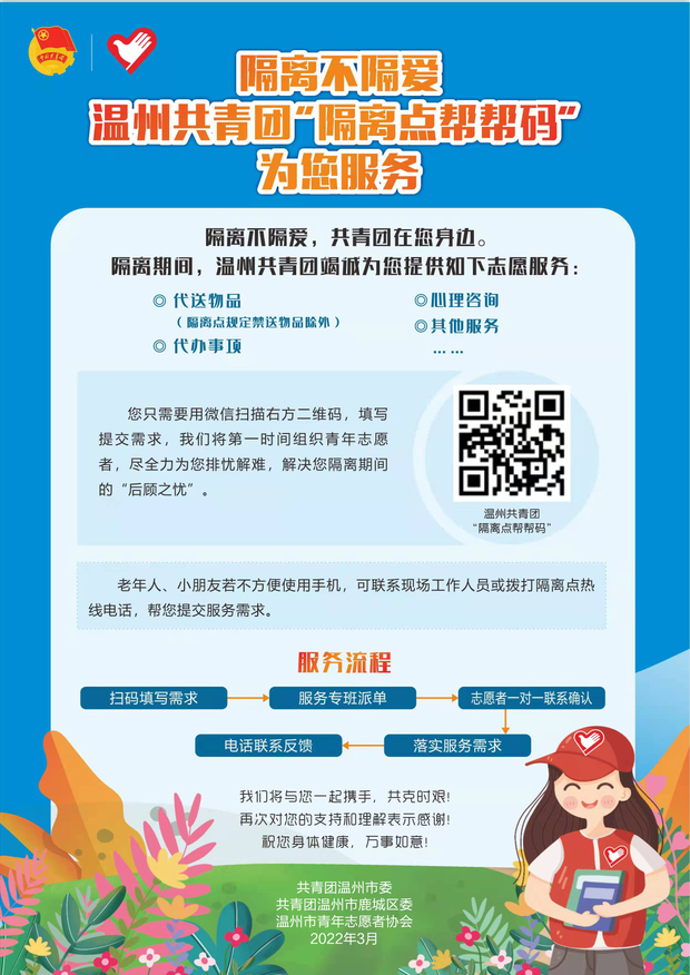为了更好地做好隔离人员的服务工作,3月11日,温州市县两级团委推出了“隔离点帮帮码”,鹿城团区委第一时间将宣传海报转发至20个隔离点微信群内,半小时内就收到了隔离人员的需求。(文 徐立星 宋佳)