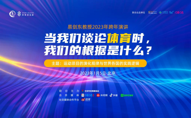 1月5日,由体育bank和中国移动咪咕公司联合出品,北京市体育基金会联合主办的2022-2023易剑东教授第五届跨年演讲在北京星光·视界中心三层演播厅开讲。此次跨年演讲主题为“运动项目的演化逻辑与世界各国的实践逻辑”,易剑东教授围绕“当我们谈论体育时,我们的根据是什么?”这一命题进行了深度分享。此次跨年演讲在全平台全网直播,体育bank视频号单平台同步观看人数达4.7万,单平台点赞近10万。