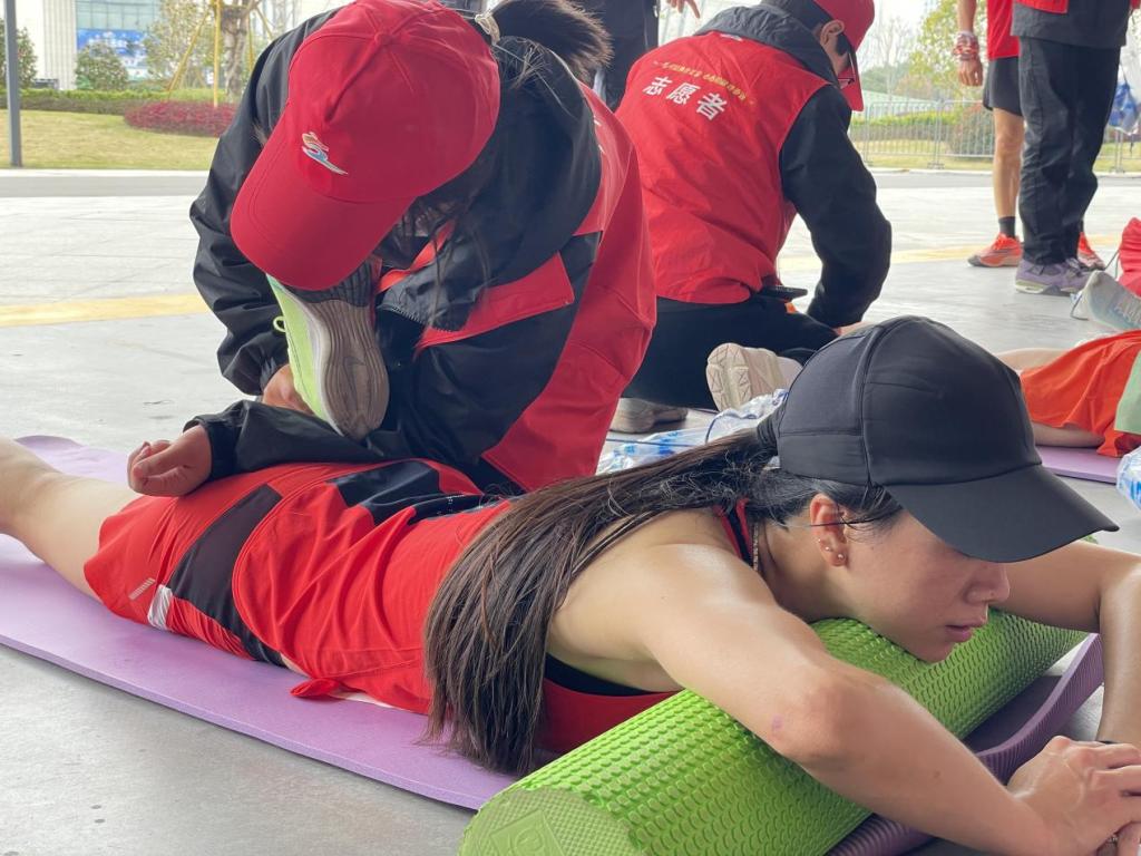清晨六点,BB贝博艾弗森官网赛场服务志愿者们全部抵达赛场,大家分工明确、井然有序,做好各项准备工作。9点左右,参赛选手陆续抵达终点,志愿者们运用肌肉静态牵伸、按摩等放松手法为参赛选手们缓解运动后的疲劳。“第一次参加这么大型的赛事,虽然不能亲身参加比赛,但能够以志愿者的身份,运用专业所学贡献一点力量,也是一种收获。”来自2022级休闲体育班的吕旭凯说完,便投入有序的志愿服务工作。“特别有专业精神和奉献精神,由于服务人数众多,志愿者们体力透支,手都使不上劲了,还坚持用脚给运动员放松!”马拉松赛后放松工作负责人柯叶航评价道。