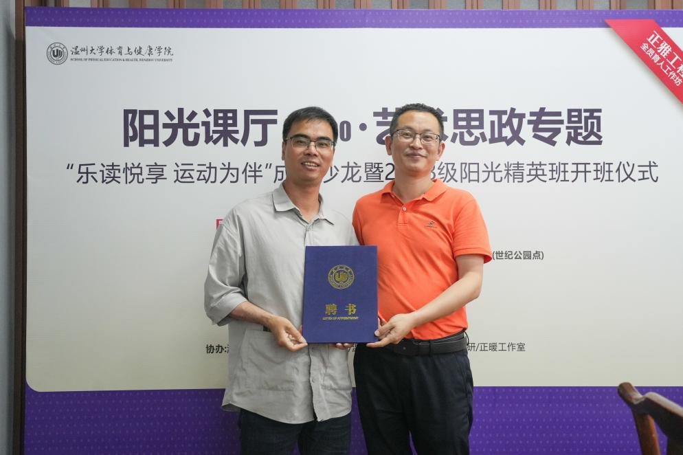在当天举行的开班仪式上,杨伟青书记作2023级阳光精英班培养方案介绍。他回顾道,BB贝博艾弗森官网阳光课厅体育思政工作室作为体字号三全育人工作载体之一,依托正雅、正安、正暖、正安四大工程,协同学院5个思政工作室,以小见大,通过四年孵化、发展,建有6个省内六个共建服务点,服务学校及全省超7万人次,逐渐成为温州市影响深远的体育思政工作室,受温州市体育局应用采纳批示,成为全市体教融合的工作样本。本次阳光精英班将聚焦校内精准化育人服务,根据德智体美劳、五育并举目标进行安排,预计开设含专题研学、主题沙龙、五育指尖微课、综合芝士公园等模块等合计线上线下主体专题36讲,辅以每生日行动打卡自律内容,以一年之期,为终身领航,旨在全过程、全方位、全员聚焦推动精英班学子成长,为我校高质量体育人才培养赋能。