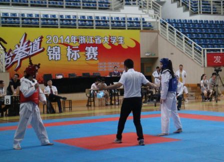 由浙江省教育厅、浙江省体育局主办的2014年浙江省大学生跆拳道锦标赛日前在浙江树人大学举行。来自全省26所本科院校的31支代表队,300多名运动员参加本次锦标赛的甲组(本科组)和丙(体育专业组)比赛。