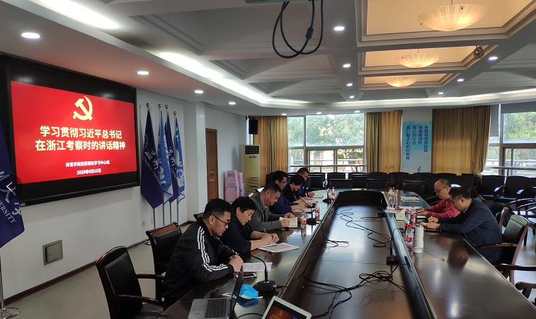 4月15日,北校区行政楼125会议室,体育学院党委召开党委理论学习中心组会议,学习贯彻习近平总书记浙江考察重要讲话精神。会议由学院党委书记应中主持,学院全体领导班子成员参加会议。