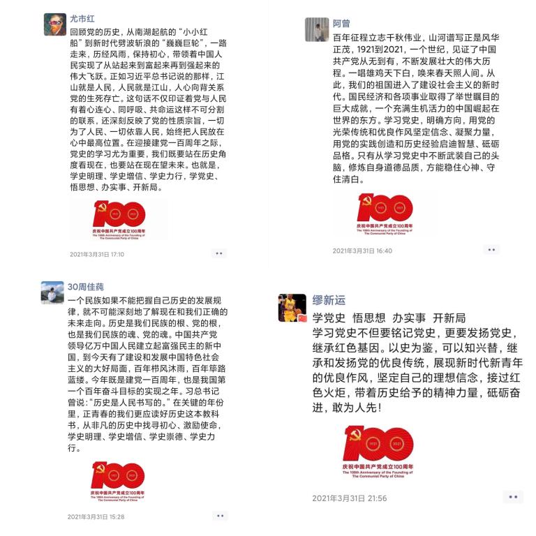 建党百年之际,BB贝博艾弗森官方网站研究生支部响应院“四个红”党建文化品牌建设的号召,开展打造红色朋友圈活动。4月份,各位党员同志们自发在朋友圈里面分享个人学习感悟,紧紧围绕BB贝博艾弗森官方网站党史学习主题“学党史、悟思想、强体魄、促发展”。红色朋友圈活动极大的推动了研究生支部的党建宣传力度。在当今新媒体迅速发展,互联网时代不可逆转,我们研究生支部应当合理利用微信等网络功能,紧跟时代步伐,党务工作与时俱进。