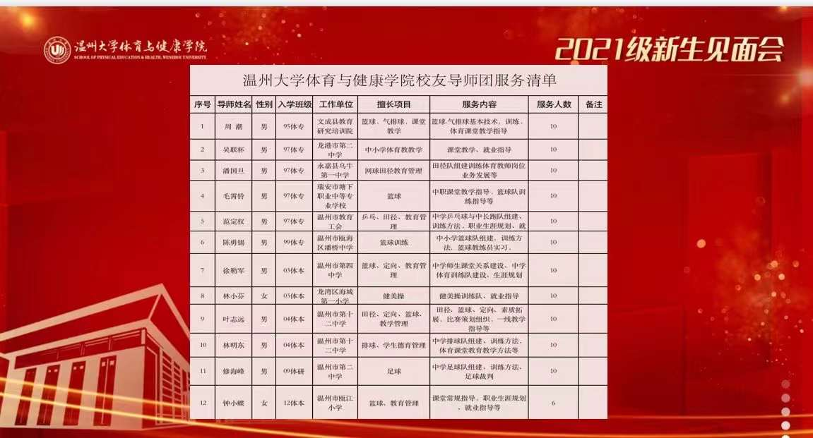 会上,首批对应请进龙港市体育教研员97体专吴联杯,温大99-02飞扬篮球队老队长、篮球资深教练99体专陈勇锡,温州四中副校长03体本徐勒军等三位校友与新老生结队,参与本研新生导航目标设计指导、诊断答疑体健学子个人优势特长训练规划,并对诸多疑难杂症提出建设性意见。