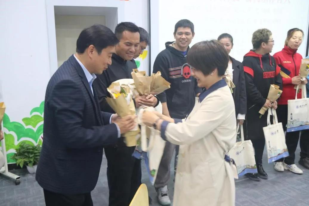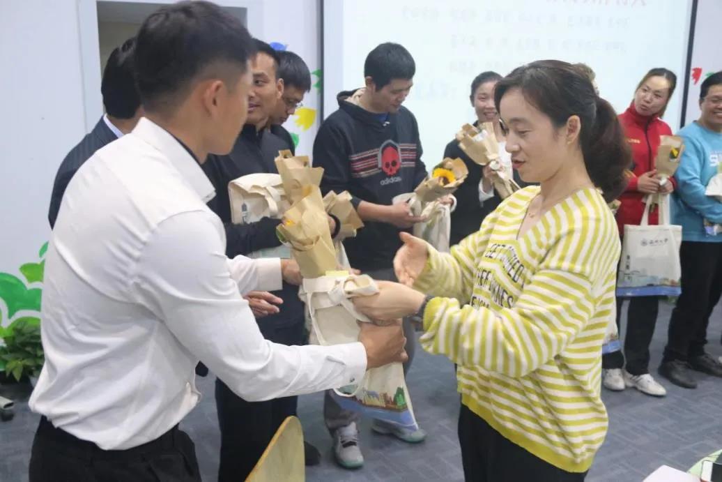 校学生处副处长吕乐和王晓华副书记为体健育人队伍发放全员育人工作包,内有象征体健精神的向日葵、育人谈话记录本、学生沟通成长书籍等,将陪伴老师们渡过温暖师生交流成长时光。