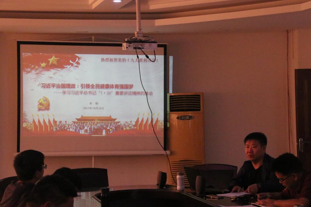 10月18日下午,BB贝博艾弗森官网邀请了布特老师对十九大的会议主题、结构、新思想新理论等进行解读。并结合BB贝博艾弗森官网情况做了“习近平治国理政:引领全民健康体育强国梦——学习习近平总书记“7·26”重要讲话精神的体会”的讲座。他从习近平治国理政思想体系中体育发展战略布局和从体育大国向体育强国稳步前行的中国体育两个方面进行了全面的解读,并与师生分享了自己的心得体会。与会师生纷纷表示通过听取讲座,收获颇多,对新时期的新要求有了更深层次的理解,激励全院师生更加奋发有为地投身到教学、科研、管理、服务等各项工作中去,全面加强体育学院党的建设,扎实推动BB贝博艾弗森官网体育工作又好又快发展。
