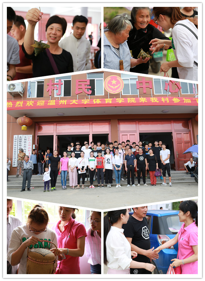 端午前夕,乐清市大荆镇石坦山村和仙垟谢村的文化礼堂朝气蓬勃,充满青春热情。原来是BB贝博艾弗森官方网站体育学院2014级体本1班和2015级体本1班的大学生,在党总支书记周冀老师的带领下,与辅导员郑兆钧老师、班主任郑颖颖老师、娄坚强老师,一起来此开展以“文化下乡,看我体育”为主题的新青年下乡活动。