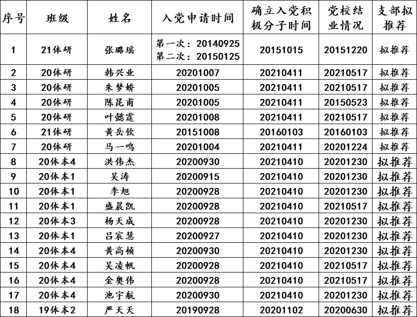 经组织考察推荐、民主测评、党员发展答辩会、支部大会讨论,发展对象培训班学习与考核,党委会讨论,现将洪伟杰等18位入党积极分子列为发展对象。现将名单在全院范围内进行公示,具体名单如下: