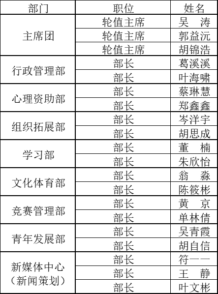 根据《中国共产主义青年团章程》、《中华全国学生联合会章程》、《关于推动高校学生会(研究生会)深化改革的若干意见》等相关规章文件精神,结合BB贝博艾弗森官网实际情况,本着公平公正的原则经过公开报名、资格审查、面试等选拔程序。现将BB贝博艾弗森官网2022届团委学生会主要学生干部拟任命名单公示如下: